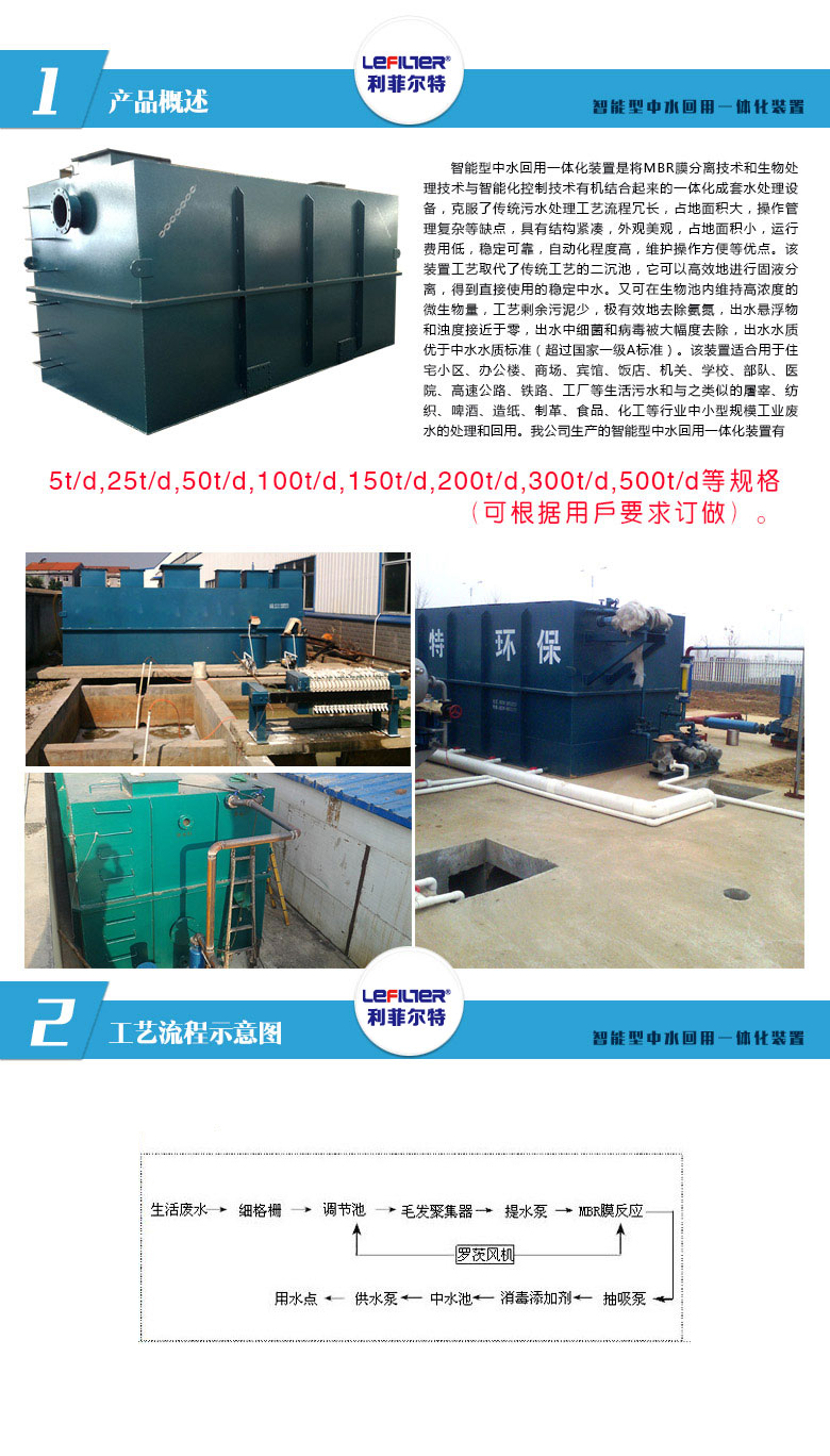 智能型中水回用一體化裝置是將MBR膜分離技術和生物處理技術與智能化控制技術結合起來的一體化成套水處理設備??朔藗鹘y污水處理工藝流程冗長,占地面積。擻延玫,穩定可靠,自動化程度高,維護操作方便等特點。