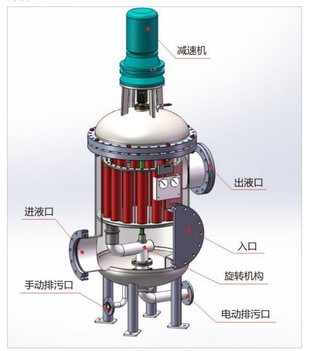 多柱式自清洗過濾器為轉(zhuǎn)臂式結(jié)構(gòu)過濾器,是一種集約化的過濾器,它主要由外殼、電動機、減速機、差壓控制器、CPU可編程控制器、電控箱、閥門、精密濾芯、支撐部件、反洗臂等組成。多個濾筒安裝于一個過濾器筒體內(nèi),結(jié)構(gòu)緊湊。被過濾的液體從進口進入過濾器,經(jīng)過下固定板進入濾網(wǎng),液體從濾網(wǎng)內(nèi)側(cè)流向外側(cè),并從濾筒出口流出過濾器;反沖洗排出的雜質(zhì)從排污口排出。過程描述:液體從濾網(wǎng)內(nèi)側(cè)流向外側(cè)過程中,固體顆粒被截留在濾網(wǎng)內(nèi)側(cè)。隨著污染物的增多,過濾器污染側(cè)和清潔側(cè)之間的壓差也逐漸增大。當壓差達到設(shè)定值時,壓差表發(fā)訊,過濾器開始自動反沖洗工作過程。