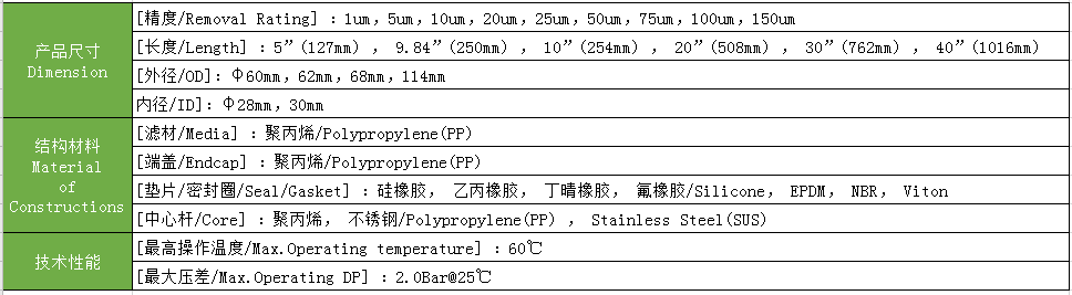 PP線繞濾芯技術(shù)參數(shù):