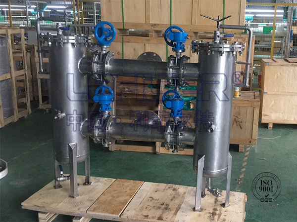 雙聯過濾器又稱并聯切換過濾器,濾筒內裝有濾袋和濾網支撐籃;頂部裝有放氣閥,供過濾時排放濾器內空氣作用。上蓋與濾筒連接采用快開式結構,更方便清洗(更換)濾袋,三只可調節式支腳可使濾器平穩放置在地面上。