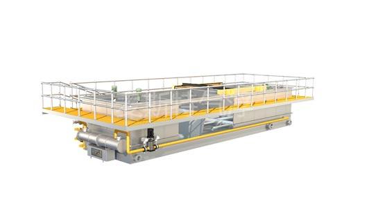 高效淺層氣浮系統是一個先進的快速氣浮系統,改傳統氣浮的靜態進水、動態出水為動態進水、靜態出水,即把含有附有微氣泡懸浮顆粒的混合污水進入氣浮池內的時候,使出流裝置移動,混合廢水的水平流速相對出流裝置為零,從而抑制了槽內的紊流,因而能進行平穩的氣浮分離(即所謂的“零速度原理”),浮選體上升速度達到或接近理論升速,極大地提高了處理效率,使廢水在淺層氣浮槽中的停留時間由傳統的30~60 min減至3 min,并且集凝聚、撇渣、排水、排泥為一體,是一種高效的廢水處理裝置。